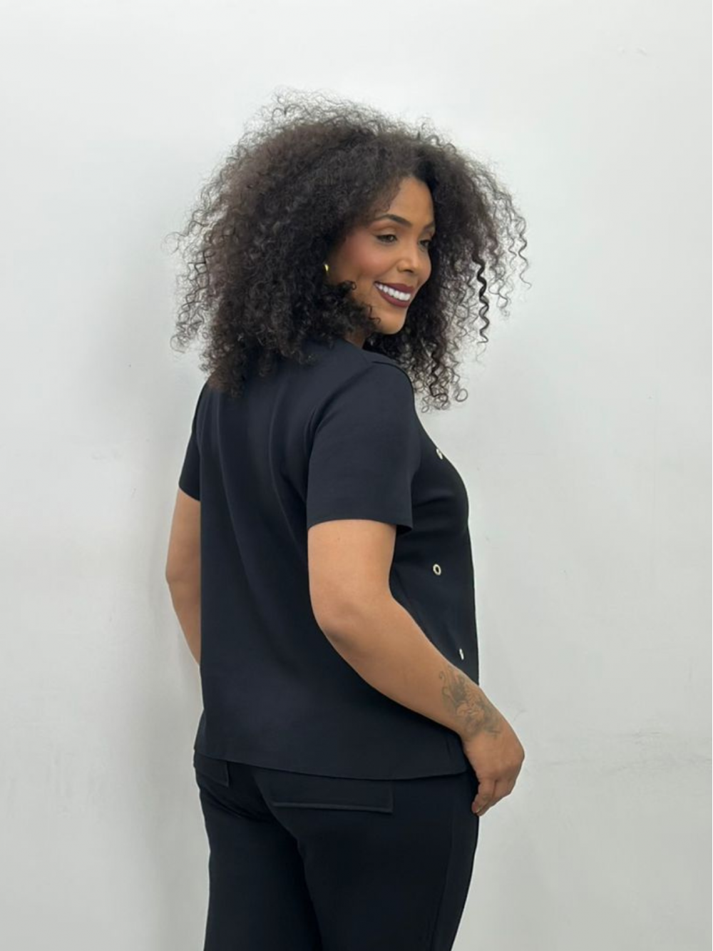 Blusa bianca malha levemente encorpada preta
